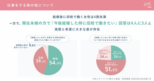 結婚後は新たな姓で働く女性の割合が半数以上。一方で、現在未婚の方で「今後結婚した時に旧姓で働きたい」回答は4人に3人と、実態と希望に大きな差が存在