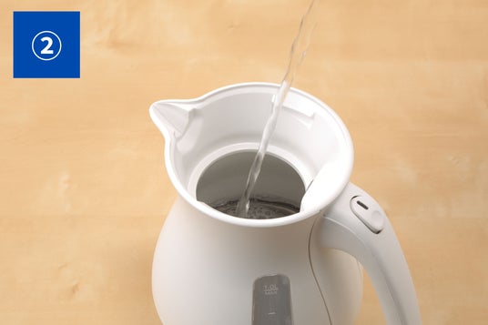 2.満水目盛りまで水を入れてまぜ、ふたをつけてお湯を沸かし、約2時間放置する。