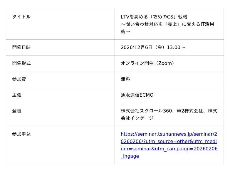 コミュニケーションプラットフォーム『Re:lation(リレーション)』を提供し、6,000社以上(※1)の導入実績を誇る株式会社インゲージ(本社:大阪府大阪市、代表取締役社長:和田 哲也)は、2026年2月6日(金)、株式会社スクロール360、W2株式会社と共同で、通販通信ECMO主催のEC事業者向け無料ウェビナー「LTVを高める『攻めのCS』戦略 ~問い合わせ対応を『売上』に変えるIT活用術~」に登壇することをお知らせいたします。