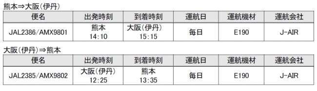 日本航空株式会社(本社:東京都品川区、代表取締役社長:赤坂 祐二、以下「JAL」)と天草エアライン株式会社(本社:熊本県天草市、代表取締役社長:吉村 孝司、以下「AMX」)は、AMXの運航乗務員の不足に伴い運休が発生している同社の熊本=大阪(伊丹)線のお客さまの利便性維持を目的に、2019年8月1日 ご搭乗分より、同路線で運航しているJAL便におけるコードシェアを開始します。