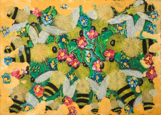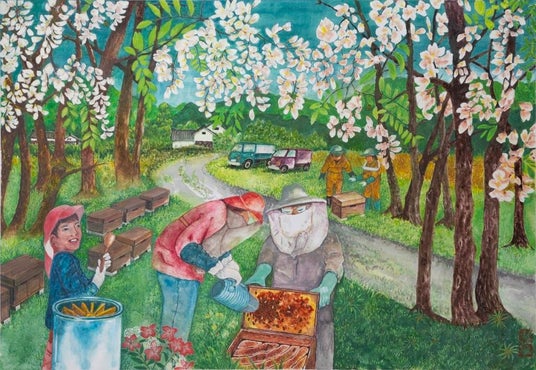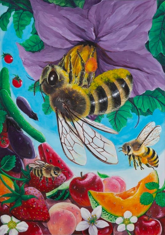 「花とミツバチ」「自然の中のミツバチ」「人とミツバチ」など、自然環境の大切さや人との関わりを感じられるミツバチを描いた絵画