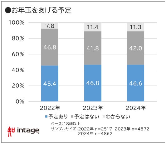 次からはあげる側の動向を見ていきましょう。「お年玉をあげる予定がある人」は46.6%と、昨年とほぼ同じ数字でした(図表2)。2022年は新型コロナの余波が帰省などにも影響し、あげる予定はないが少し多かったですが、ここ2年の傾向はかなり似ているようです。