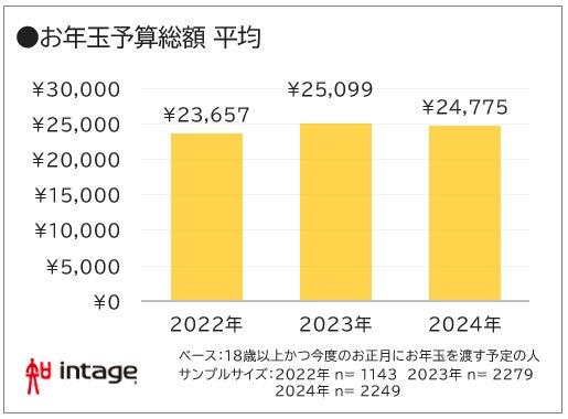 お年玉をあげる予定はほぼ変わらなかったですが、「予算総額の平均」はどうなっているでしょう?こちらも24,775円で昨年から微減となっています(図表3)。2023年調査では前年比6%増でしたが、今年はあげる人同様にほぼ変化はありませんでした。