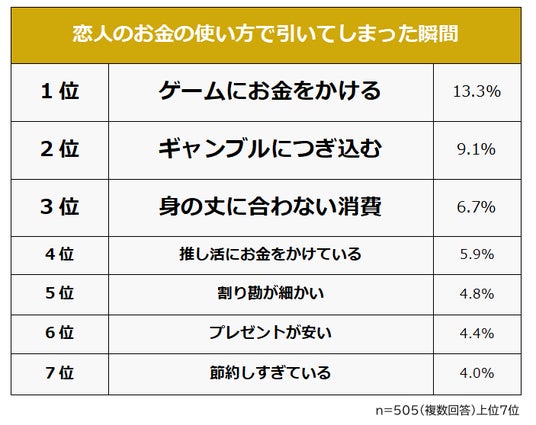 全国の男女505人に「恋人のお金の使い方で引いてしまった瞬間」を聞いたところ、1位は「ゲームにお金をかける(13.3%)」でした。2位「ギャンブルにつぎ込む(9.1%)」、3位「身の丈に合わない消費(6.7%)」が続きます。