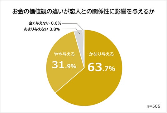 「お金への価値観の違いが、恋人との関係性に影響を与えるか」という問いには、「与える」と回答した人が「かなり」「やや」をあわせて95.6%にのぼりました。
