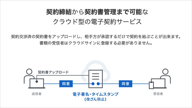 クラウドサインは、契約の締結から管理までデジタルで完結させる契約マネジメントプラットフォームです。電子署名法に準拠した電子署名とタイムスタンプによって円滑かつ、安全な契約締結を実現します。また自然言語処理技術を用いたAI契約書管理機能、契約書の振り分けのオートメーション化を実現したスマートキャビネット機能など、様々な契約管理機能により、過去に紙で締結した契約を含め一元的に検索・期限管理ができます。電子契約市場においては2015年の提供開始以来、企業や自治体などで幅広く導入されている、No.1 ※のサービスです。