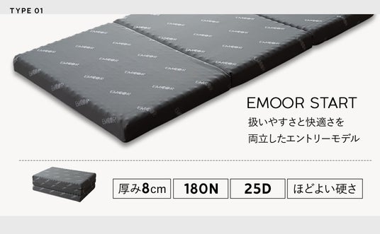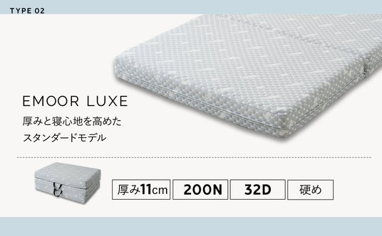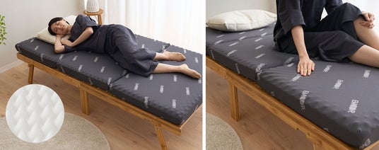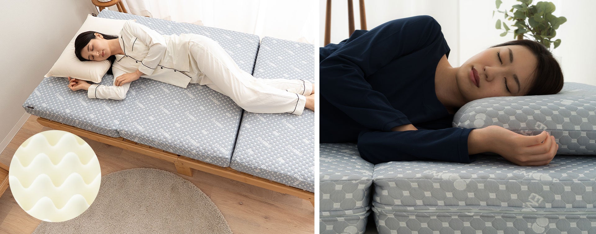 ほどよい硬さ&十分な厚みの三つ折りマットレスです。凹凸加工を施した高密度ウレタンによる体圧分散と、扱いやすい厚み設計で、快適さと使いやすさを両立。軽やかに取り入れられる、日常使いにちょうどいいエントリーモデルです。