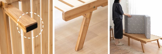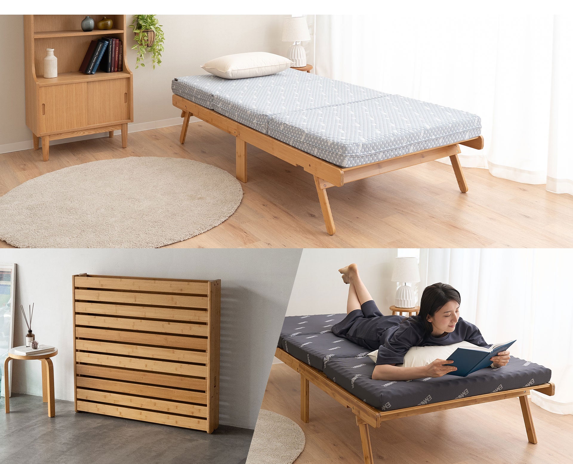 天然竹ならではの強さとしなやかさ、そして折りたたみ式の使いやすさを兼ね備えたWABINEに、寝心地研究を行うエムールの三つ折りマットレスをセットにした、リーズナブルなベッド&マットレスです。日常使いから来客用まで、暮らしに寄り添いながら長く活躍します。