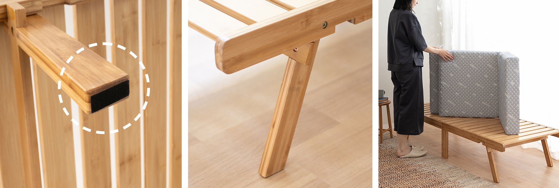 硬くて丈夫で、抗菌・調湿性に優れた竹を使い、日本的なミニマルデザインに仕上げました。届いたその日から使える完成品で、ワンルームから海外で人気のジャパンディ空間まで、快適な眠りを叶えます。