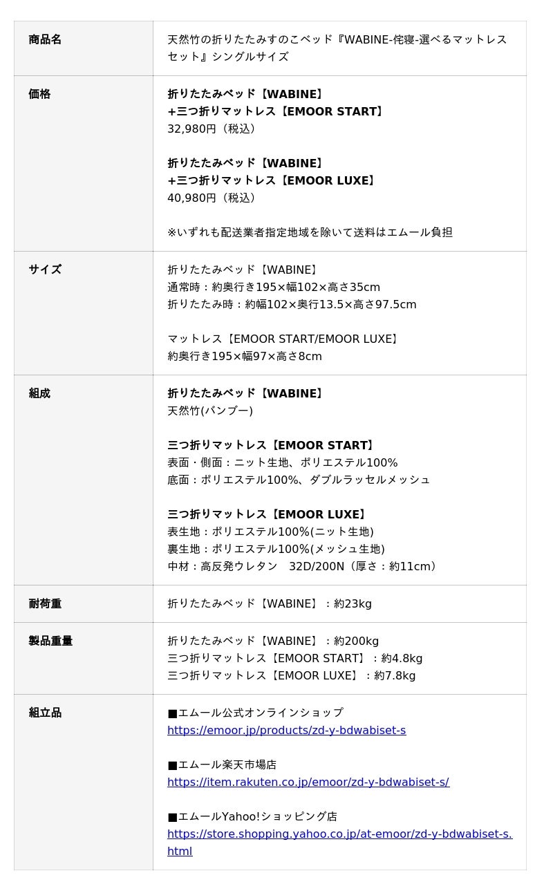 「身体に合った寝る・座る・たたむ」を提供する健康家具ブランドEMOORを展開する株式会社エムール(東京都立川市:代表取締役 高橋 幸司/以下、エムール)は、2026年4月6日より、天然竹の折りたたみすのこベッド『WABINE-侘寝-選べるマットレスセット』(以下、WABINEマットレスセット)の販売を開始しました。