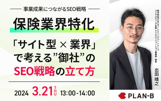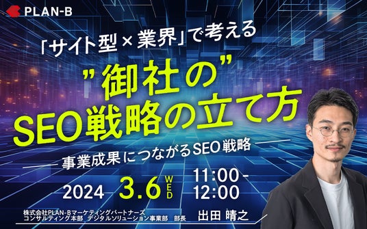 累計支援実績5,000社超のSEO事業を中心に、独自のデジタルマーケティング技術を駆使し、お客様のビジネス拡大を支援する株式会社PLAN-B(本社:東京都品川区、代表取締役:鳥居本真徳、以下当社)は、「事業成果につながるSEO戦略」をテーマに、無料Webセミナーを実施いたします。