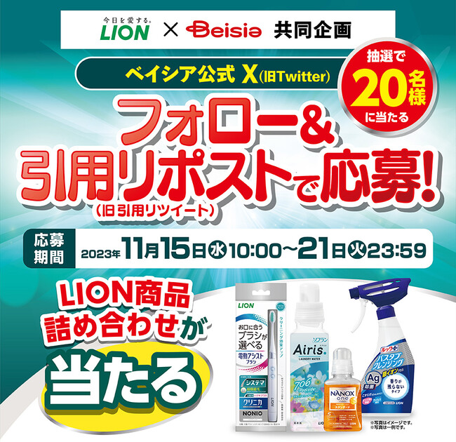 株式会社ベイシア(本社:群馬県前橋市、代表取締役社長:相木孝仁)は、ライオン株式会社(本社:東京都台東区、代表取締役兼社長執行役員:竹森 征之、以下「ライオン」)との共同企画で、11月15日(水)から11月21日(火)の期間に、ベイシア公式Xにおいて「ライオン×ベイシア Xフォロー&引用リポストキャンペーン」を実施いたします。ベイシア公式Xをフォローし、キャンペーン投稿に「#LIONでキレイな毎日」を付けて引用リポストいただいた方の中から抽選で20名様に「ライオン商品詰め合わせをプレゼントいたします。たくさんのご応募お待ちしております。