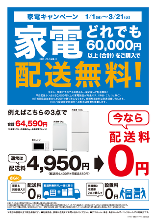 3月21日(火)まで「家電配送無料キャンペーン」を開催しています。