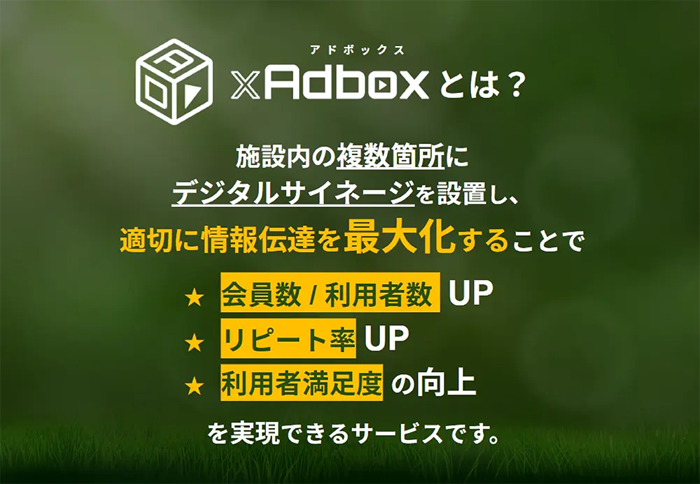 アドボックスでは、「GOLF xAdbox」を導入するゴルフ場様を募集しております。サイネージを無料で導入できるだけでなく、施設のお知らせ配信を最大限有効活用することで、新規会員数・利用者数・リピート率の向上が期待できるサービスですので、ぜひこの機会にご連絡ください。