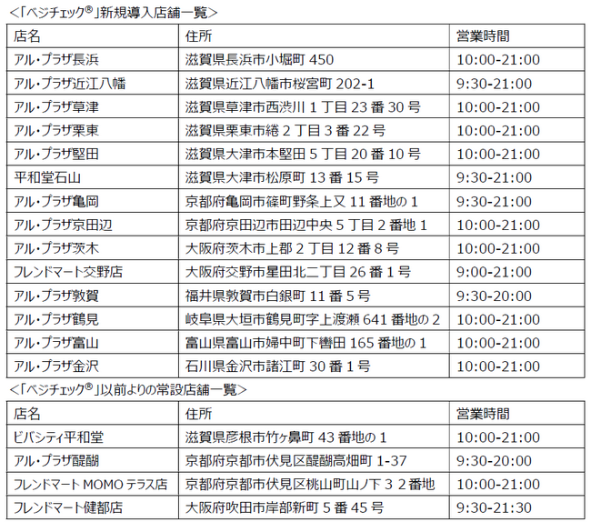 そこで、ベジチェックの常設店舗をこれまでの4店舗から18店舗に拡大し、東海や北陸の一部店舗にも平和堂として初めて導入します。今まで不定期なイベントでしか測定できなかった推定野菜摂取量を、店舗へのご来店時に気軽に測定いただけるようになることで、地域の皆様の継続的な健康づくりをサポートしてまいります。