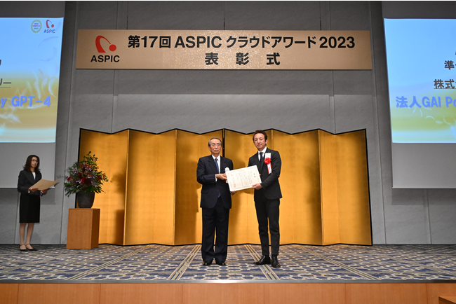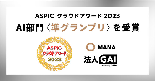 法人・行政向け業務改善ツール、AIチャットボット、AI-FAQなどを提供する株式会社ギブリー(本社:東京都渋谷区、代表取締役社長:井手高志、以下当社)は、このたび開催された「ASPICクラウドアワード2023」において、法人向けChatGPT活用プラットフォーム「法人GAI」がAI部門で〈準グランプリ〉を受賞したことをお知らせいたします。