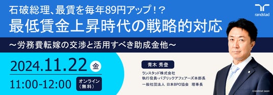 総合人材サービスを提供するランスタッド株式会社(本社:東京都千代田区 代表取締役社長 猿谷哲)は、11月22日に人件費上昇への対応に悩む経営層や人事担当者などを対象にしたウェビナー「最賃を毎年89円アップ!?最低賃金上昇時代の戦略的対応~労務費転嫁の交渉と活用すべき助成金他~」を開催いたします。第2次石破内閣発足後も注目される急激な最低賃金引き上げ目標に対応し、労務費上昇の今後の見通しを含めた戦略的対応など実践的な戦略をランスタッド執行役員の青木秀登がご説明します。本ウェビナーは、10月に開催され、好評を得たウェビナーの第二弾となります。