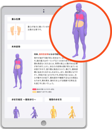 「シセイカルテ」は、重心の偏りや前後左右のゆがみを数値で評価し、ゆがみの原因となる部位を3Dアバターで分かりやすく可視化します。さらにゆがみ改善エクササイズも提案し、利用者に自分の姿勢を客観視させつつ、その後の改善行動を促します。