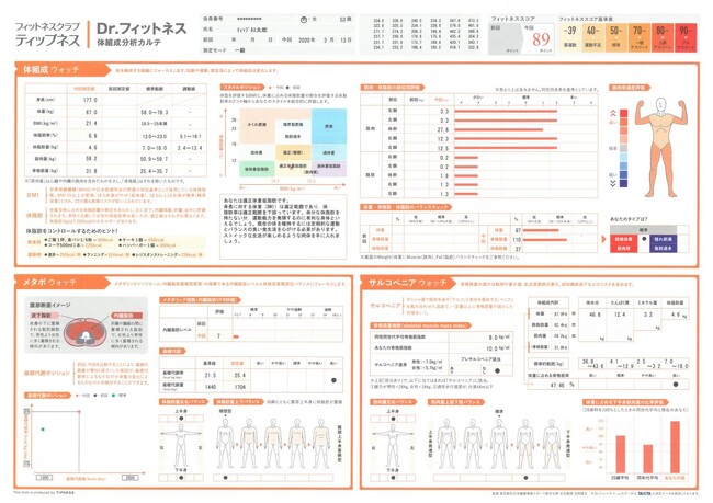 体脂肪・筋肉量などの体組成から今のカラダの状態を徹底分析する、ティップネスオリジナルのカルテ。数十秒測定器に乗るだけでカラダの詳細がわかります。