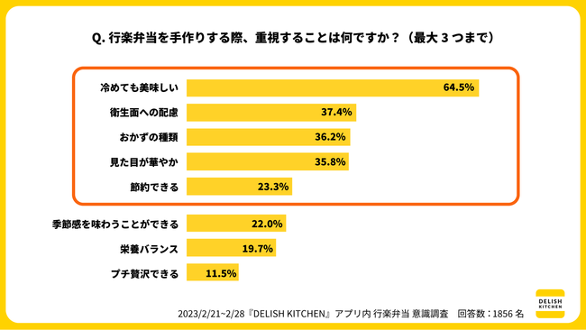 さらに、行楽弁当を手作りする際に重視することについては、「冷めても美味しい」かどうかが64.5%で1番重視されていることが分かりました。続いて意識されているのは、37.4%で「衛生面への配慮」。暖かくなる季節、コロナウイルスだけでなく食中毒など衛生面への配慮は欠かせません。以降は、「おかずの種類 36.2%」、「見た目が華やか 35.8%」「節約できる 23.3%」が続きました。