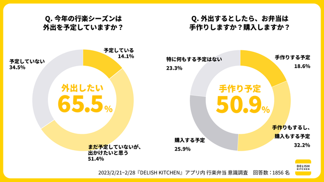 暖かい日が増えてきて、お花見やピクニックなど外でお弁当を食べたくなる季節になってきました。『DELISH KITCHEN』がユーザーに行ったアンケートでは、今年の行楽シーズン(花見やゴールデンウィークなど)は外出を予定しているかとの問いに対し、「予定している」「まだ予定はしていないが、出かけたいと思う」と回答した人が65.5%と半数以上となりました。また、外出時にお弁当を食べるとしたら手作りするか、購入するかを尋ねると、「手作りする予定」「手作りもするし、購入もする予定」と回答した人が50.9%と半数を超えました。3月13日からはマスク着用も個人の判断に委ねられることとなり、自粛解禁ムードが伺えます。