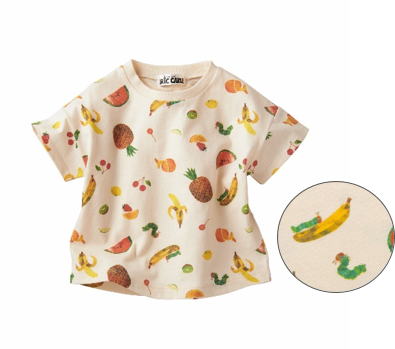 独創的かつカラフルでかわいい色使いが魅力的な絵本が表現されたTシャツです。お子さまの身近なくだものが描かれた総柄や、まるで絵本を見ているかのようなデザインなど、はらぺこあおむしの世界観を表現して、全3種類のデザインを取り揃えました。