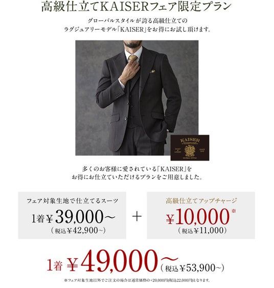 オーダースーツ専門店「グローバルスタイル」を運営するグローバルスタイル株式会社(東京証券取引所 スタンダード市場:7126、本社:大阪市中央区、代表取締役社長 田城弘志)は、最高峰を誇るグローバルスタイルオリジナルモデル「カイザー」がお得な『高級仕立てKAISERフェア』のデザインを刷新いたしました。