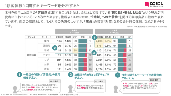 木材を使用した店内の「雰囲気」に関する口コミからは、会社として掲げている“感じ良い暮らしと社会”という理念が消費者に伝わっていることがうかがえます。旗艦店の口コミには、“「地域」への土着化”を掲げる無印良品の戦略が表れています。両店の課題として、「レジ」での決済のしやすさ、「店員」の接客「対応」などの会計時の体験、などがありそうです。