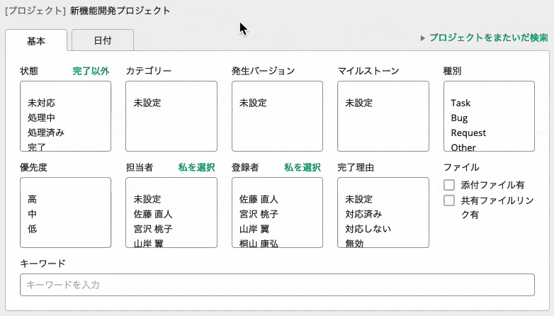 Backlogの高度な検索機能などでリスト内の複数の項目を選択したいとき、これまでは、Command キーや Ctrl キーを押すことで選択することが可能でした。今回のアップデートにより、クリックするだけで複数の項目を選択できるようになり、その都度他のキーを押す煩雑さを解消しました。範囲を指定した選択は、これまで通り Shift キーを押しながらクリックすることで可能です。