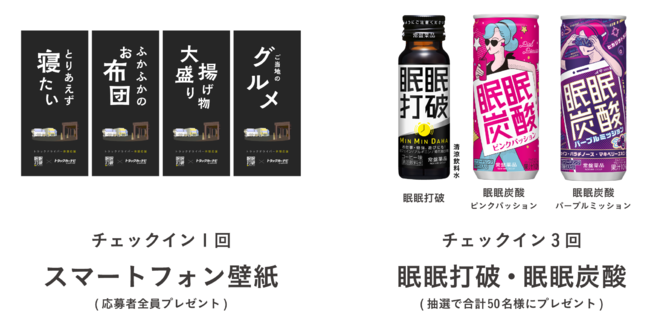 3回チェックインした方の中から、抽選で合計50名様に『眠眠打破』もしくは『眠眠炭酸』をプレゼントいたします。チェックインが1回でも、応募者全員に本キャンペーンオリジナルスマートフォン壁紙をプレゼントいたします。