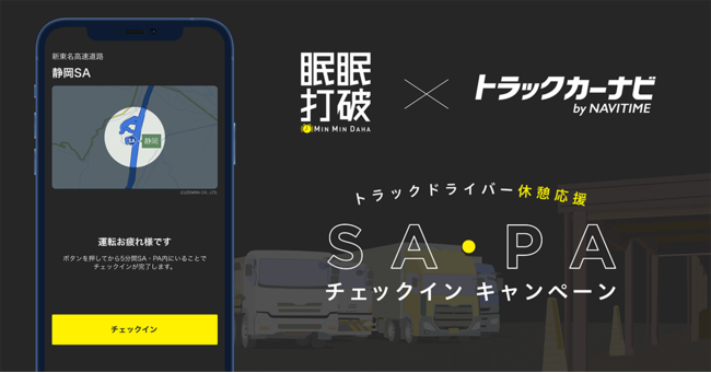 ノエビアグループ常盤薬品工業株式会社(本社:東京都港区)の頑張る人を応援するドリンク『眠眠打破』と、株式会社ナビタイムジャパン(代表取締役社長:大西啓介、本社:東京都港区)のトラックドライバー専用カーナビアプリ『トラックカーナビ by NAVITIME』は、2023年3月27日(月)から4月9日(日)まで、トラックドライバーの安全運転を応援する「SA・PAチェックインキャンペーン~トラックドライバー休憩応援~」を実施いたします。