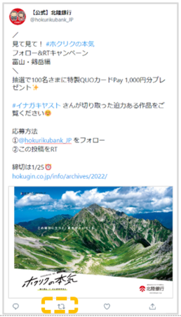 本キャンペーンでは、期間中に、当行公式Twitterアカウントをフォローのうえ、「ホクリクの本気(富山県・剱岳)」の作品が掲載された指定の投稿をリツイートいただいた方の中から、抽選で100名さまに、「ホクリクの本気」オリジナルデザインのQUOカードPay 1,000円分をプレゼントいたします。指定の投稿に掲載する作品は、富山を代表する山である剱岳を、イナガキヤストさん独自の視点で切り取った迫力のある1枚です。