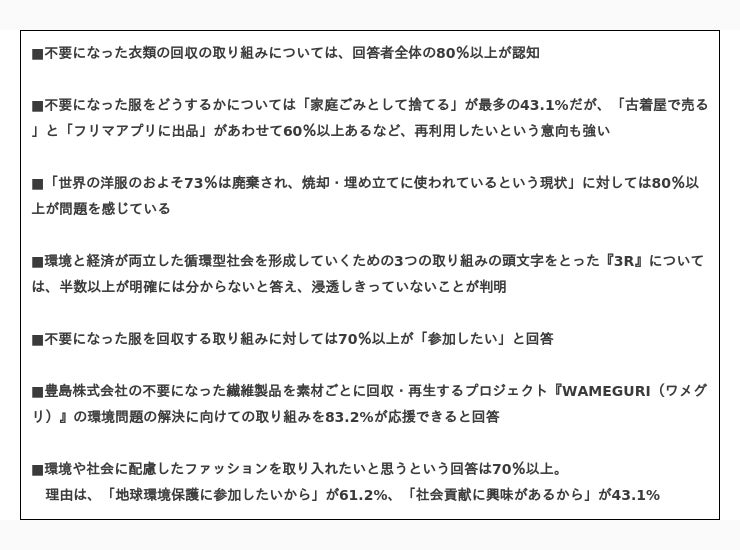 今回の調査を通して、個人レベルでの衣料品再回収の現状と、企業が行う衣類回収プロジェクトへの認知の高まりや、それらに参加したいという意欲の高さが見えてきました。ファッションを楽しんだ後の廃棄の部分についても、引き続きファッション業界と消費者の方々が共に考え行動していくことが必要だといえるのではないでしょうか。