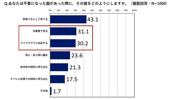 不要になった服を「家庭ごみとして捨てる」という回答が43.1%と最多でした。一方で、「古着屋で売る」(31.1%)、「フリマアプリに出品する」(30.2%)といった回答がそれぞれ3割を超えました。約6割の人が不要になった服を捨てずに再利用をしていると推測できます。