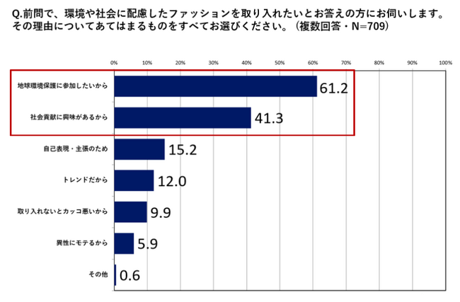 環境や社会に配慮したファッションを取り入れたいと思うという回答をした方に理由をうかがったところ(※複数回答可)、「地球環境保護に参加したいから」が61.2%、「社会貢献に興味があるから」が43.1%と上位にのぼりました。以上のことから、ファッションを通して地球環境保護や社会貢献に取り組みたいと思っている方が多くいらっしゃり、トレンドや自己表現などの理由として考えている人は少ないことがわかります。