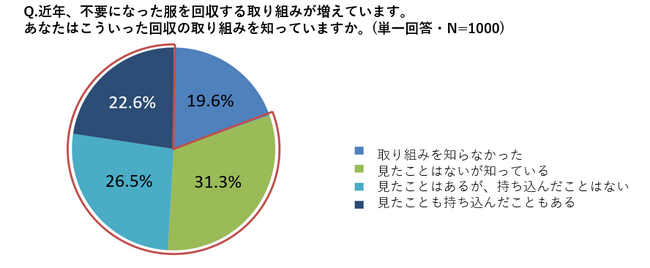 不要になった衣類の回収の取り組みに対しては80%以上が認知しており、浸透の高さがうかがえます。一方で、知っているが行動に移せていない層が6割近くいることも判明しました。