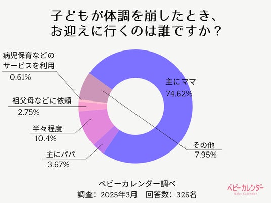 突然の発熱や体調不良で園や学校からの「お迎え要請」……。「そんなとき、誰が迎えにいくか?」という質問に対し、74.62%が「主にママ」と回答しました。一方「主にパパ」はわずか3.67%、「半々程度に分担」は約10.4%にとどまります。