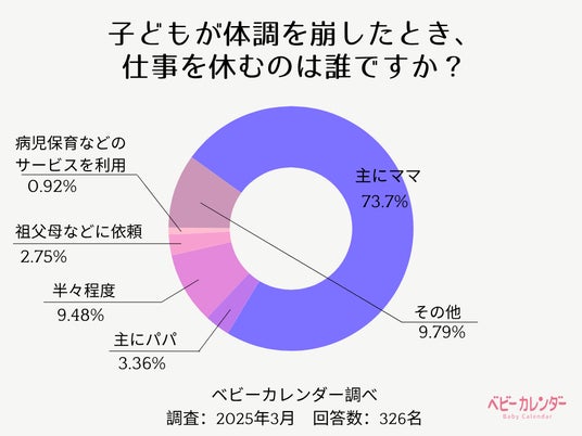 「誰が仕事を休んで看病するか?」という質問でも、73.7%が「主にママ」と回答。「主にパパ」と回答したのは3.36%、「半々程度」は9.48%と、こちらも「急なお迎え対応」とほぼ同じ傾向が見られました。