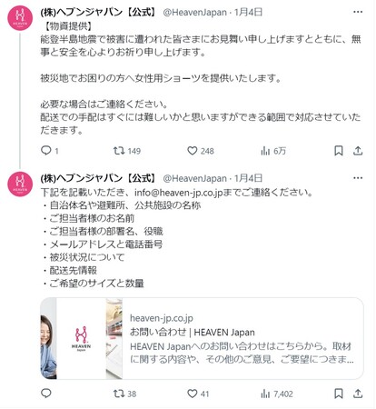 1月4日にHEAVEN Japan公式X(コーポレートアカウント)にて必要とされる方へ女性用ショーツ提供の呼びかけを行ったところ、救援物資として下着のご要請をいただいたため、1月10日にショーツ1,020枚を送らせていただきました(M/500枚 L/500枚 3L/20枚)。