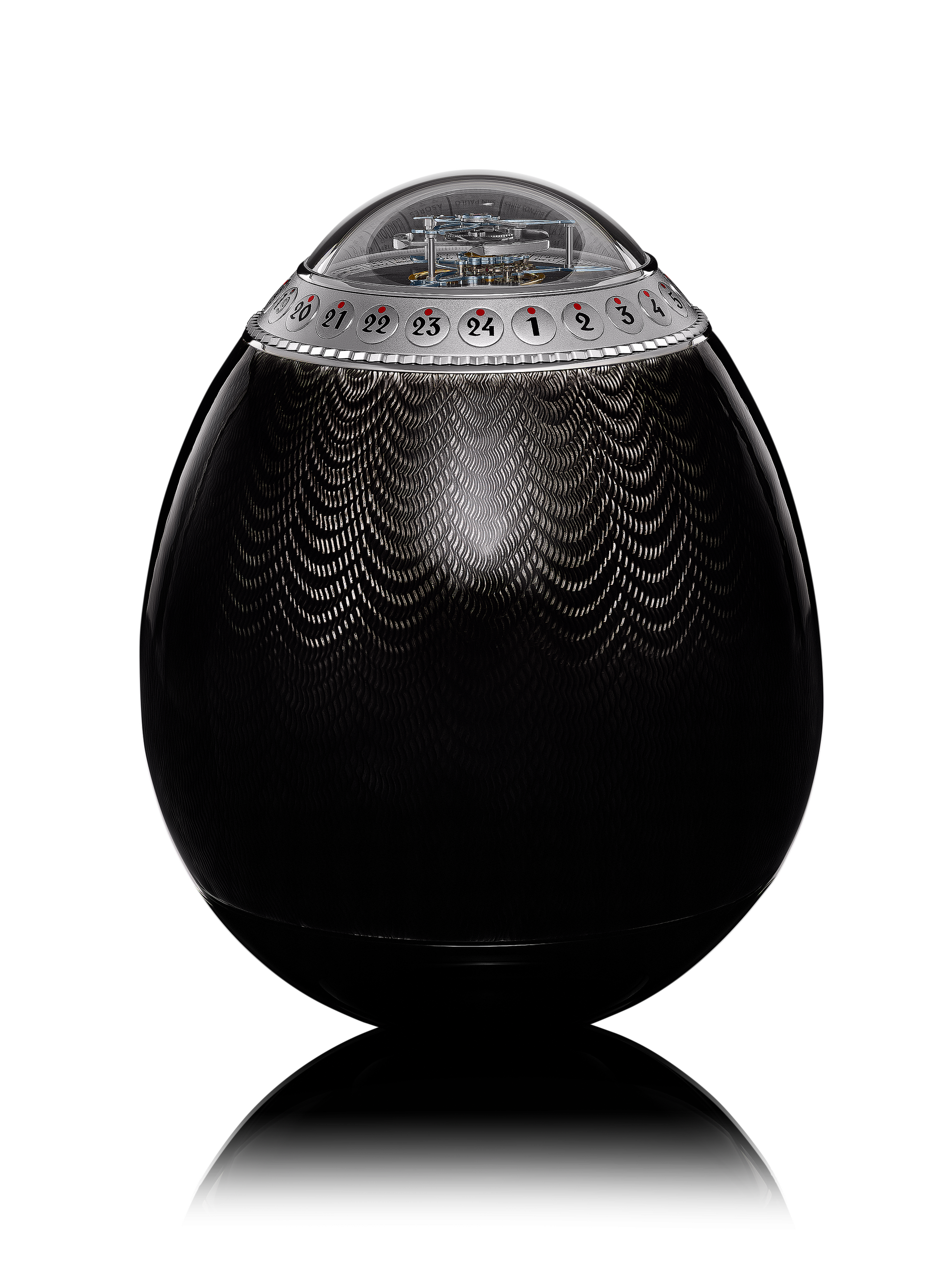 《St. Petersburg Easter Egg Tourbillon Clock》は、その名の通り、ロシアを代表する宝飾工芸「イースターエッグ」から着想を得たテーブルクロックです。