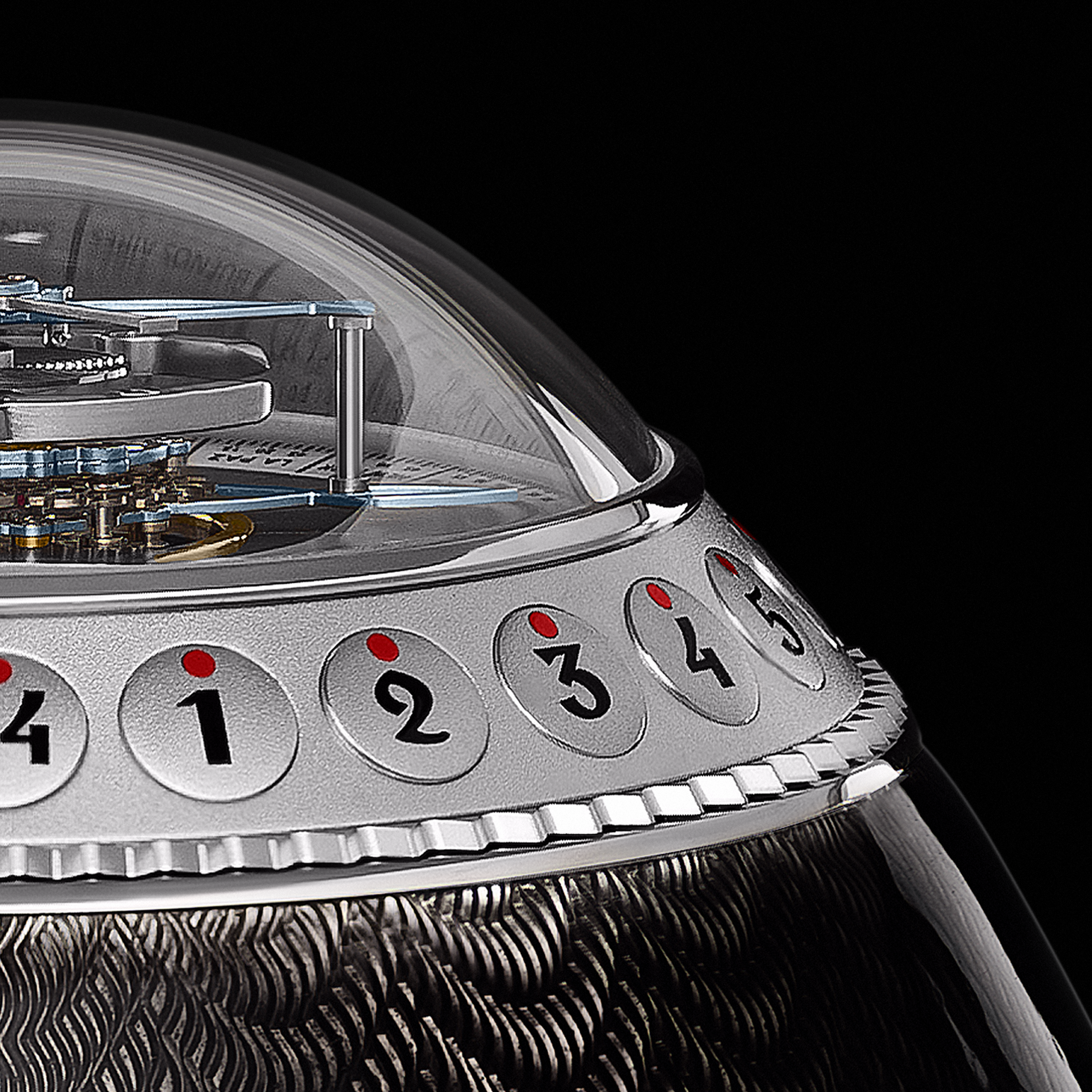ミラーポリッシュ仕上げのステンレススチール製ベース、その上に手彫りギョーシェと半透明のホットエナメルで装飾されたシルバー製ケース、トゥールビヨンと時刻表示を覆うドーム型サファイアクリスタルという、3つの主要パートで構成されています。