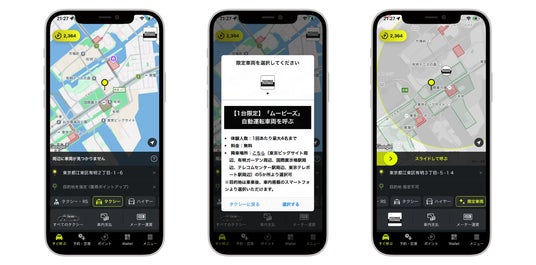 - l体験方法:「S.RIDE」アプリ上の「moveez」アイコンをタップ。車種選択画面で「自動運転車両」を選択し、乗車ポイントを指定して車両を呼び出し。車両到着後、車内タブレット等で以下の目的地から1か所を選択し、自動走行を体験。