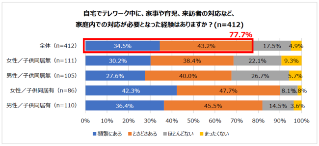 テレワークが浸透する中、来訪者の対応や子どもの世話などで仕事を中断せざるを得ないという声は少なくありません。そこで500名を対象に、テレワーク中でも育児や家事をはさみつつ働くことが会社で認められているかを聞いたところ、82.4%が認められていると回答しました。このような働き方が認められていると回答した412名に、実際に家事や育児、来訪者対応などの仕事以外の用事で仕事を中断するような対応が必要となった経験があるかどうか聞いたところ、約8割(77.7%)の方がこうした「ちょい抜けワーク」を経験していることが明らかになりました。