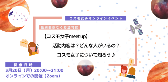株式会社Kanatta(東京都目黒区、代表取締役社長:井口恵)が運営する「コスモ女子」は、3/20(月)に様々なバックグラウンドのあるコスモ女子会員がどのような活動しているのかを大公開する場として、「コスモ女子meet up」を開催します。