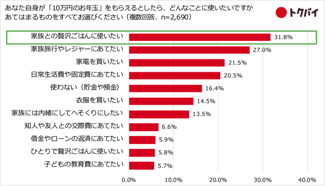 くふうカンパニーグループにおいて、チラシ・買い物情報サービス「トクバイ」を運営する株式会社ロコガイド(以下「ロコガイド」)は、「トクバイ」ユーザー2,690名を対象に、「お年玉に関するアンケート」を実施しました。その結果、自分自身が10万円のお年玉をもらえるとしたら、やりたいこと第1位が「家族との贅沢ごはん」となりました。