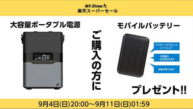 楽天市場「Show !t」は9月4日(日)20時から、アウトドアで大活躍する、MEISTER.F大容量ポータブル電源をご購入いただいたお客様に、お出かけ中のデジタル端末の充電に便利な、2,980円相当のモバイルバッテリーをプレゼントします。また、9月4日(日)20時~9月11日(日)01時59分まで開催される、全商品ポイント10倍プレゼント(一部商品を除く)楽天スーパーセールに参加します。