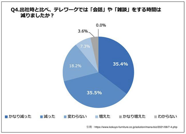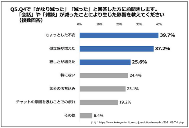 ある調査では、コロナの影響を受けてテレワークになった人の約7割が「会話」や「雑談」をする時間が減ったと回答し、さらにその中の多くが不安や孤独を感じていることがわかっています。