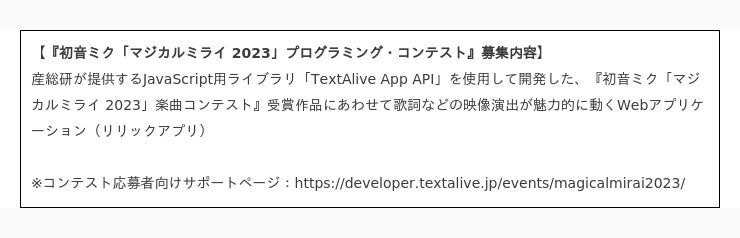 ◆コンテスト応募者向けサポートページ:https://developer.textalive.jp/events/magicalmirai2023/