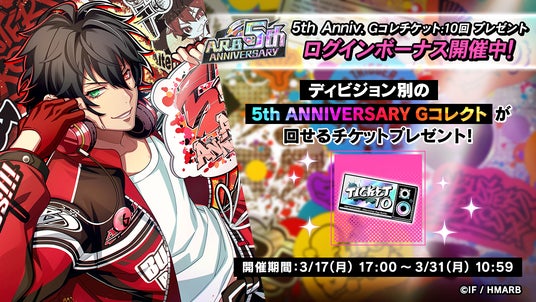 5th ANNIVERSARYを記念し、6ディビジョン全18キャラクターの【5th Anniv.】シリーズが手に入るGコレクトを開催します。ディビジョン別に6つのGコレクトが登場し、5th Anniv. Gコレチケット、5th Anniv. Gコレチケット:10回またはジェムで回すことができます。