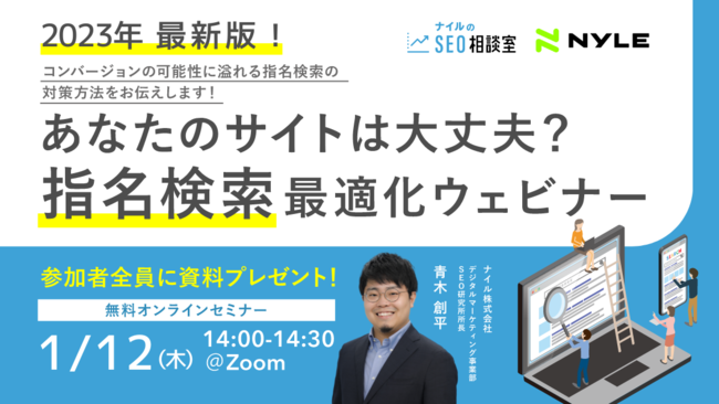 「ナイルのマーケティング相談室」を運営するナイル株式会社(本社:東京都品川区、代表取締役:高橋 飛翔、以下、ナイル)は、1月12日(木)14:00から、売上アップに繋がる重要な “指名検索”の対策方法を解説する「2023年最新!指名検索 最適化ウェビナー」を開催します。